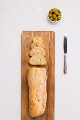 Elaborado en masa de ciabatta, con aceitunas cuidadosamente seleccionadas, ideal para acompañamientos de platos fuertes. Con corteza crocante y esponjoso en su interior.